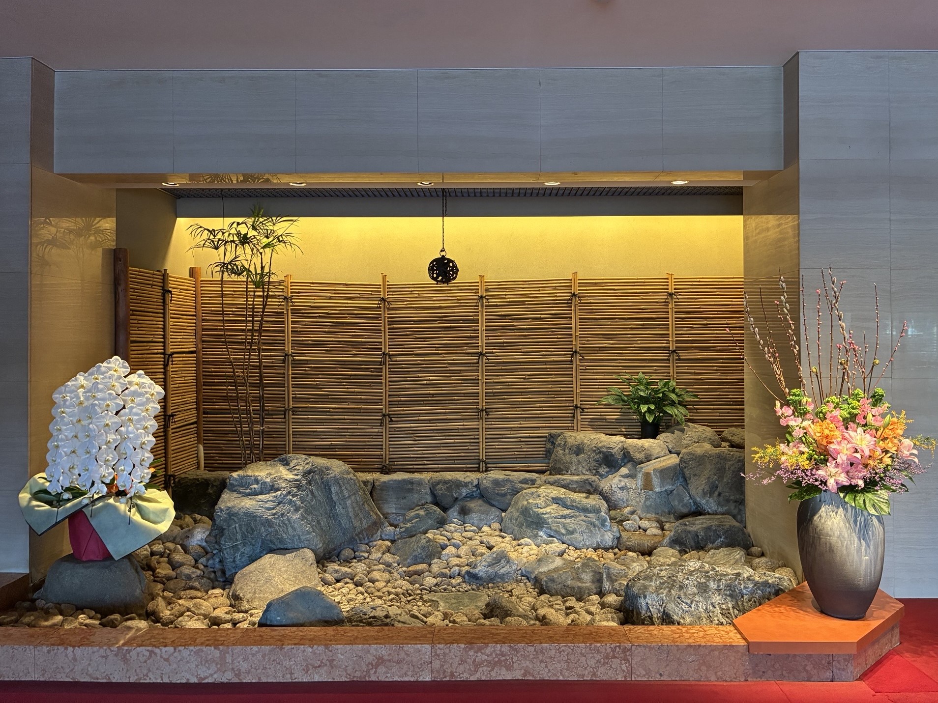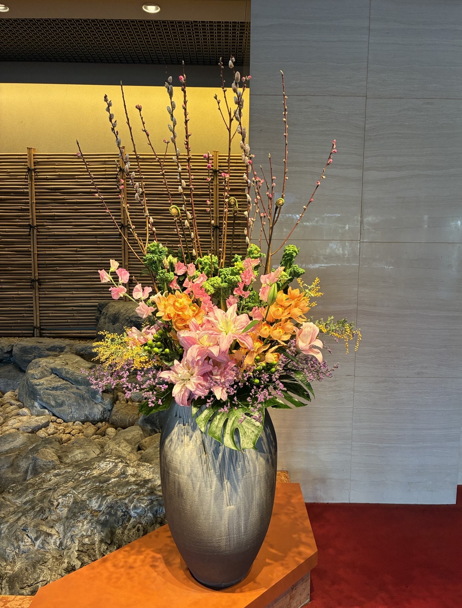 今週のロビーのお花は花桃、赤芽柳、ぜんまい、ハイブリットスターチス、